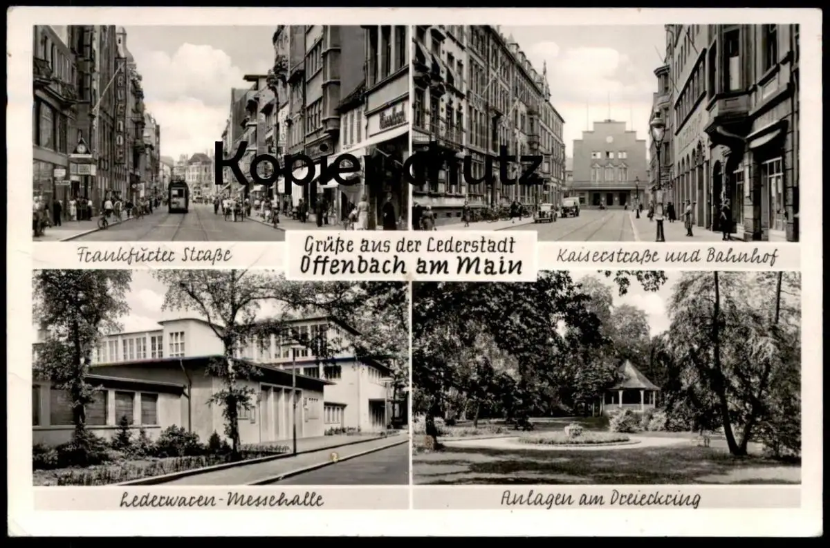 ÄLTERE POSTKARTE LEDERSTADT OFFENBACH Bahnhof Tram Straßenbahn Tramway Kaufhof Dugena Uhr Lederwaren Messehalle gare