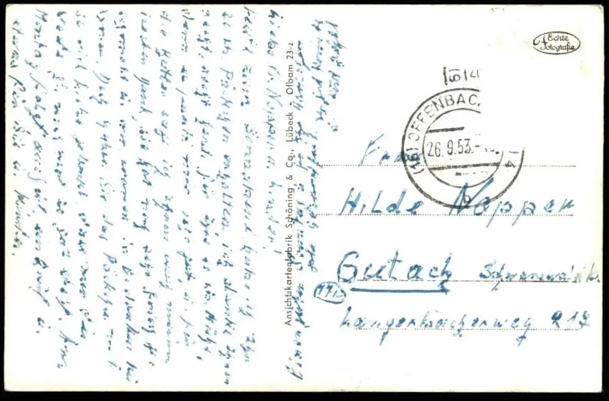 ÄLTERE POSTKARTE GRÜSSE AUS DER LEDERSTADT OFFENBACH FRANKFURTER STRASSE KAISERSTRASSE UND BAHNHOF LEDERWAREN MESSEHALLE ANLAGEN AM DREIECKRINGVerlag: Schöning & Co., LübeckGelaufen: 26.09.1953 mit Stempel Offenbach nach Gutach, Briefmarke (sauber) entfernt,Erhaltung (s. Scan): gut, starker Stempelabschlag / 915909