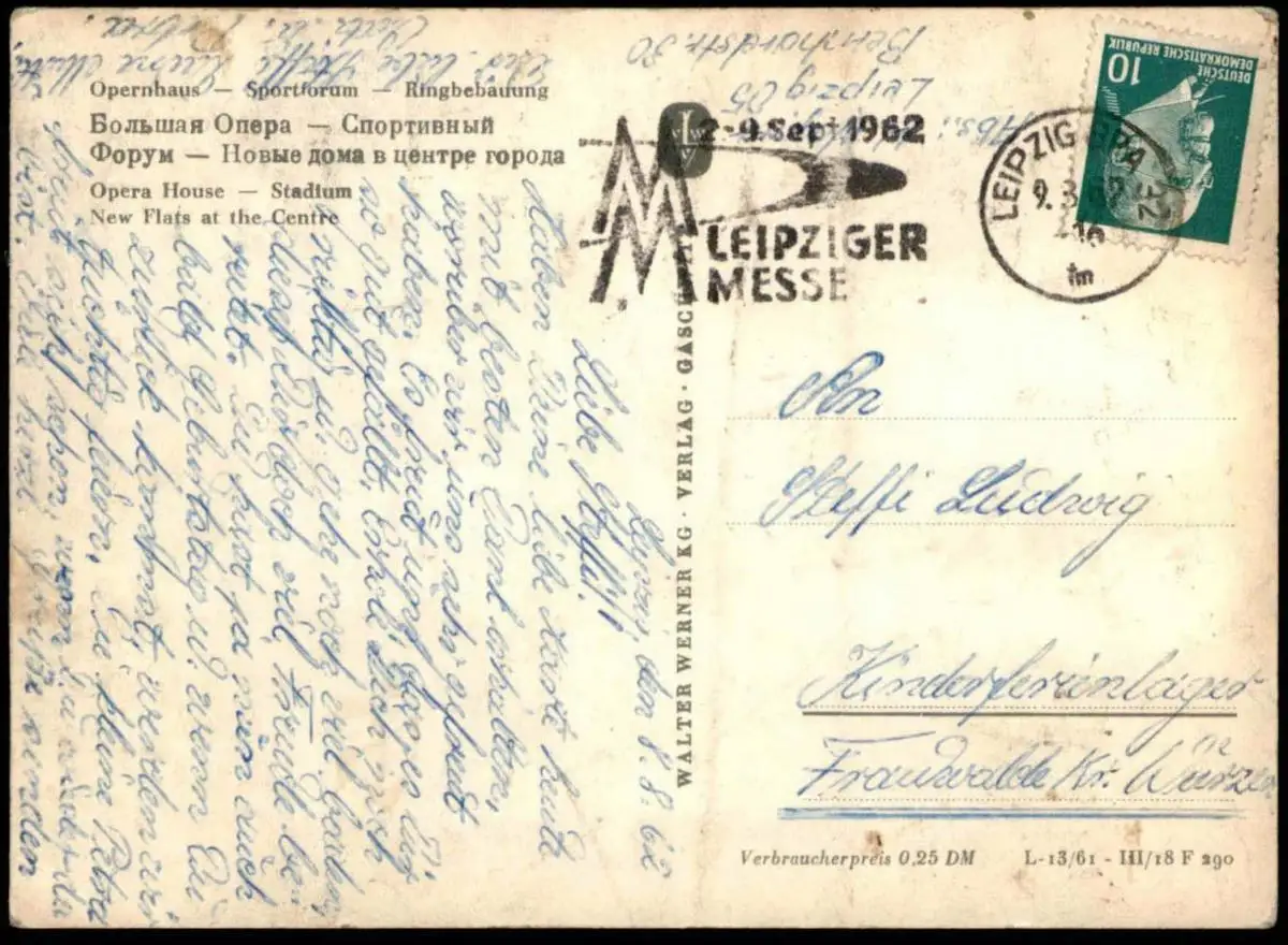 Verlag: Walter Werner, GaschwitzGelaufen: 09.03.1962 mit Stempel Leipziger Mess IMM nach Kinderferienlager Frauwalde bei WurzenErhaltung (s. Scan): mittel, vorderseitig zwei kleine bräunliche Punkte, rückseitig leicht verfärbt / 916175