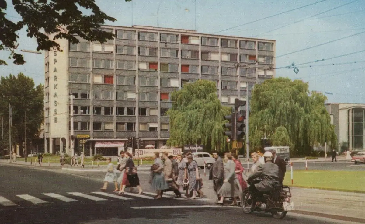ÄLTERE POSTKARTE LEVERKUSEN STADTHOCHHAUS PLAKAT KEINE ATOMWAFFEN SOWIE CDU no nuclear weapon Motorrad postcard cpa