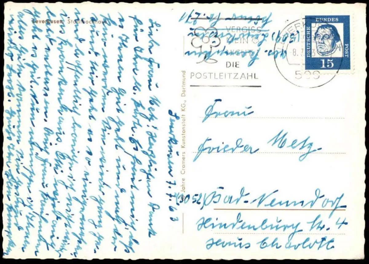 Gelaufen: 08.07.1963 mit Stempel Leverkusen nach Bad Nenndorf