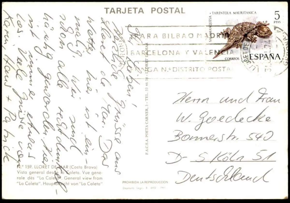 Gelaufen: 31.07.1974 mit Stempel Lloret de Mar nach Köln