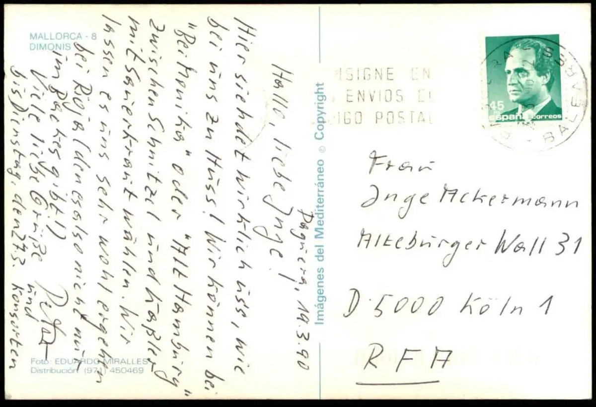 Gelaufen: 20.03.1990 mit Stempel Baleares nach Köln