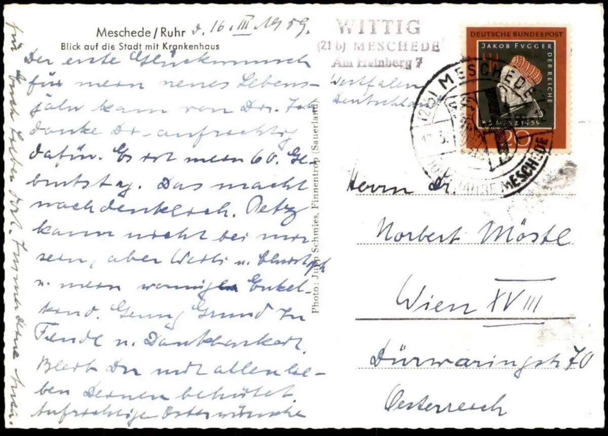 Gelaufen: 17.03.1959 mit Stempel Meschede nach Wien XVIII, Briefmarke Jakob Fugger