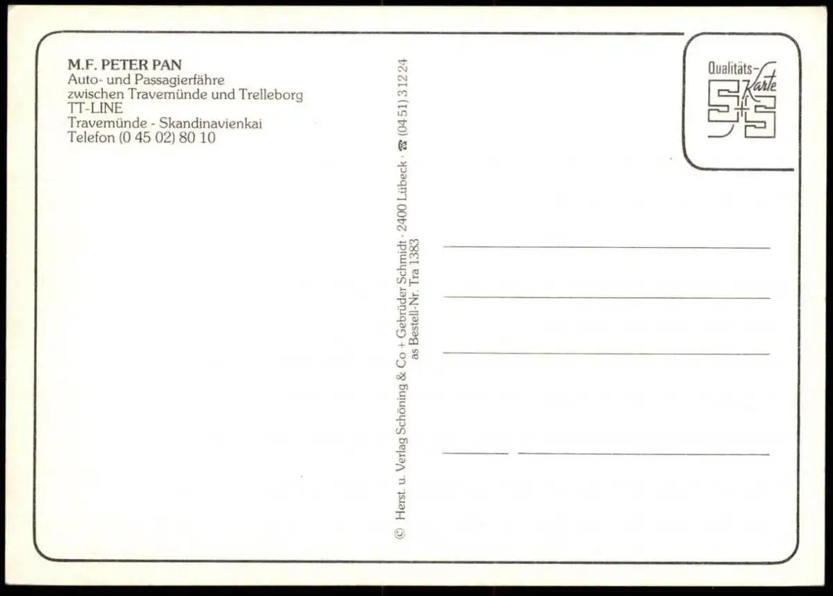 ÄLTERE POSTKARTE M.F. PETER PAN TT LINIE AUTOFÄHRE & PASSAGIERFÄHRE ZWISCHEN TRAVEMÜNDE & TRELLEBORGVerlag: Schöning & Co. + Gebrüder Schmidt, LübeckGelaufen: neinErhaltung (s. Scan): gut / 918749
