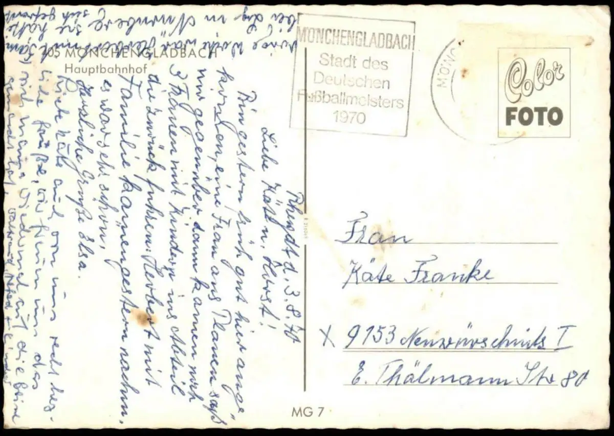 Gelaufen: 03.08.1970 mit Maschinenwerbestempel "Mönchengladbach Stadt des Deutschen Fußballmeisters 1970" nach Neuwürschnitz / Oelsnitz, Briefmarke (relativ sauber) entfernt