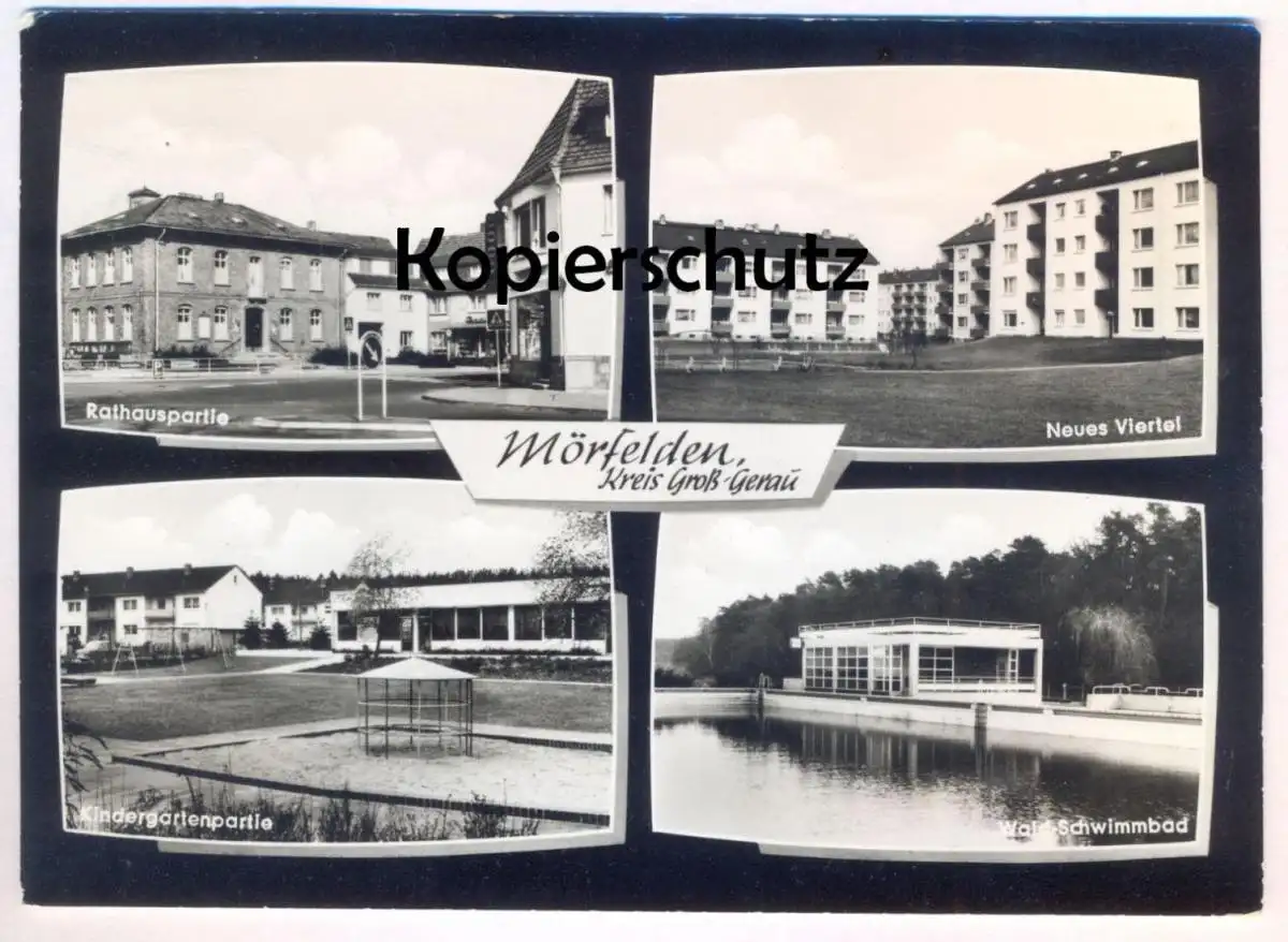 ÄLTERE POSTKARTE MÖRFELDEN RATHAUSPARTIE NEUES VIERTEL KINDERGARTENPARTIE SCHWIMMBAD MÖRFELDEN-WALLDORF Ansichtskarte