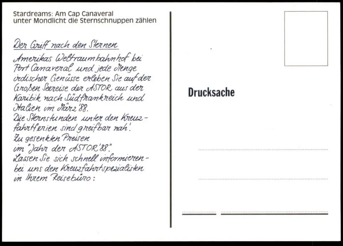 ÄLTERE POSTKARTE MÄRZ IM JAHR DER ASTOR 88 CANAVERAL MS ASTOR KREUZFAHRTSCHIFF HADAG CRUISE LINE Am Cap Canaveral unter Mondlicht die Sternschnuppen zählendVerlag: unbekanntGelaufen: neinErhaltung (s. Scan): sehr gut / 916422