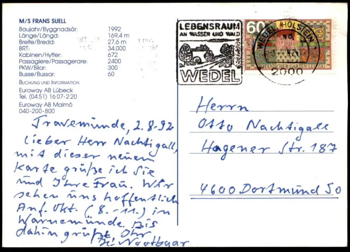 ÄLTERE POSTKARTE MS FRANS SUELL SILJA LINE EUROWAY PASSAGIERFÄHRE UND AUTOFÄHRE ZWISCHEN TRAVEMÜNDE MALMÖ KOPENHAGEN HERRENBRÜCKE LÜBECK PASSIERENDVerlag: unbekanntGelaufen: 02.08.1992 mit Stempel Wedel nach Dortmund Erhaltung (s. Scan): gut - mittel, rückseitig kleinere Albumspur, Ecke links oben bestoßen / 916713