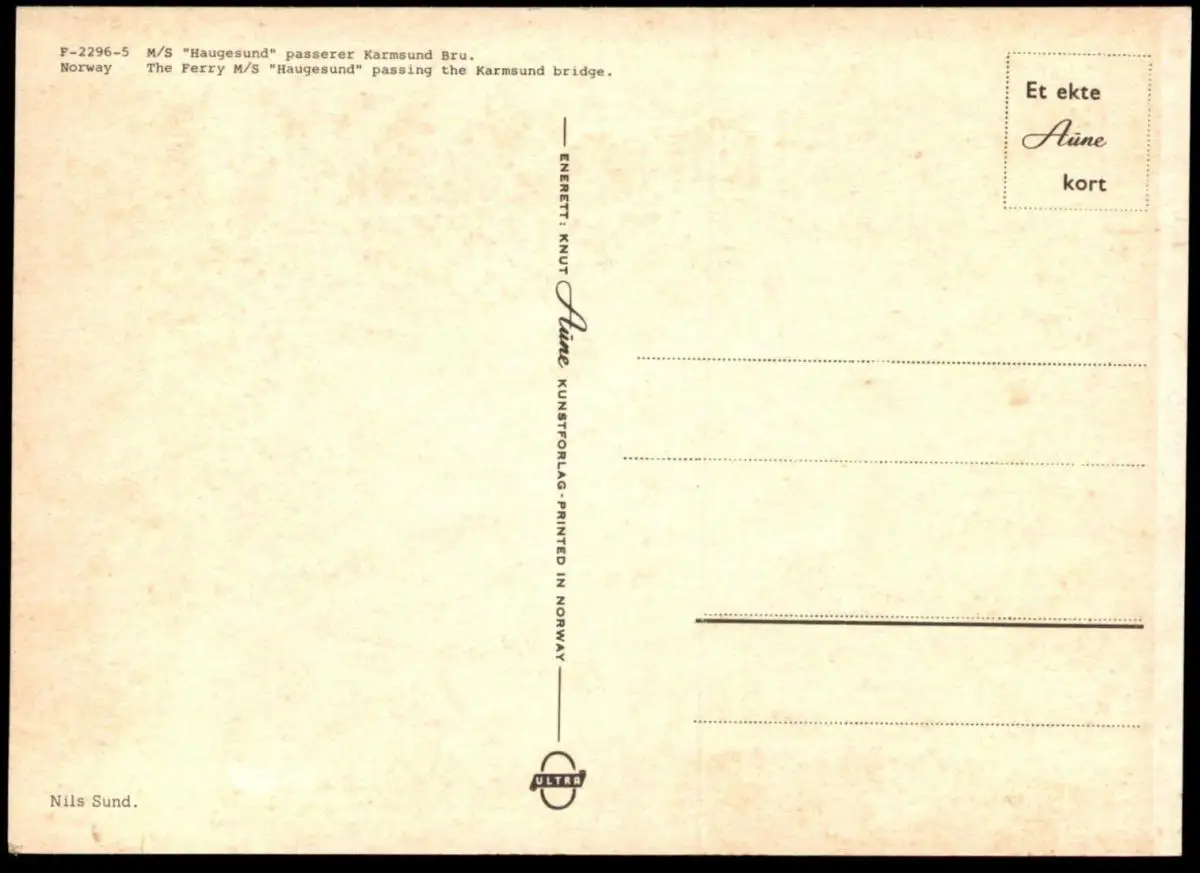 ÄLTERE POSTKARTE MOTORSCHIFF HAUGESUND PASSERER KARMSUND BRUVerlag: Knut AuneGelaufen: neinErhaltung (s. Scan): gut - sehr gut / 916178