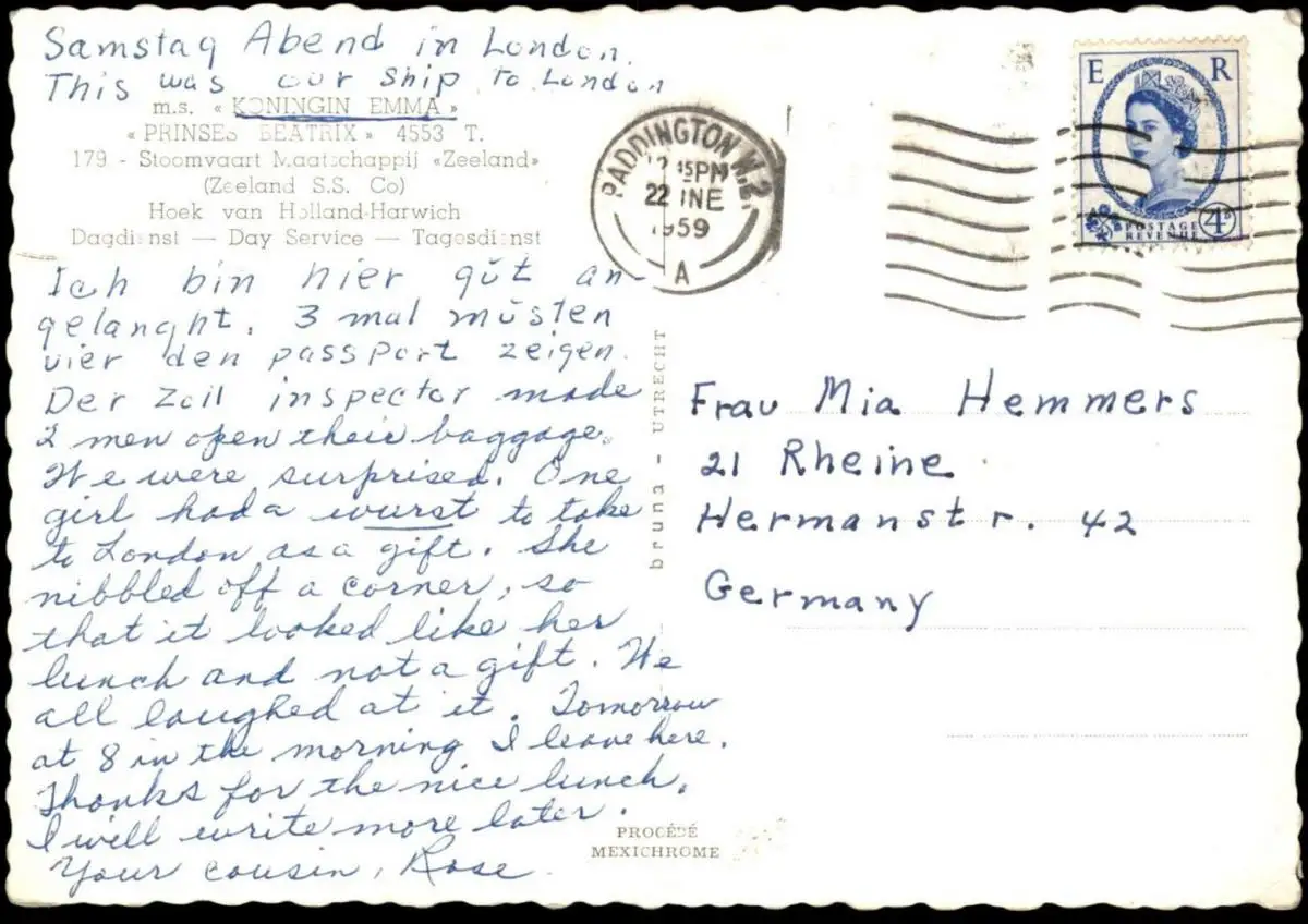 Gelaufen: 22.06.1959 mit Stempel Paddington nach RheineErhaltung (s. Scan): mittel, linke Ecken stärker bestoßen / 916526