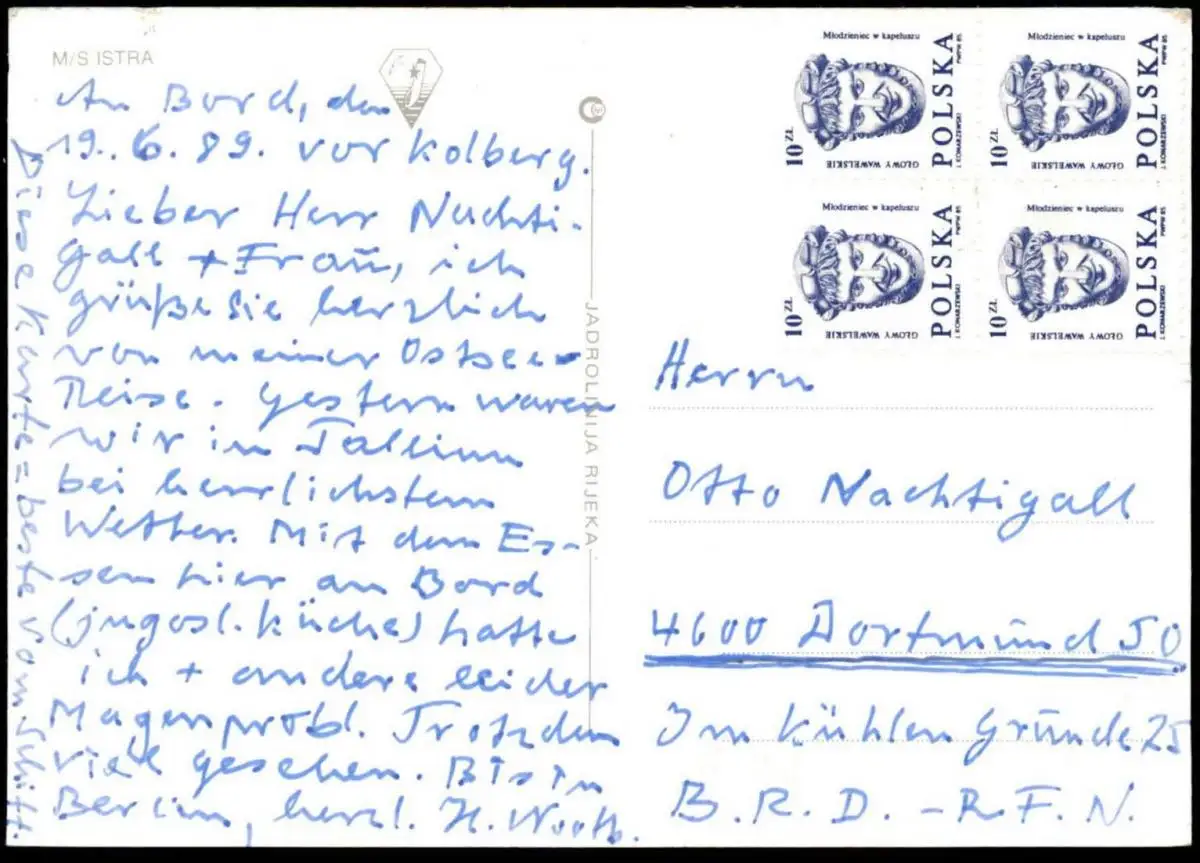 ÄLTERE POSTKARTE M/S ISTRA KREUZFAHRTSCHIFF BESCHRIEBEN AN BORD VOR KOLBERGVerlag: Jadrolinija, RijekaGelaufen: 19.06.1989 an Bord vor Kolberg nach DortmundErhaltung (s. Scan): gut, vorderseitig leichte Stempelfarbspur / 916779