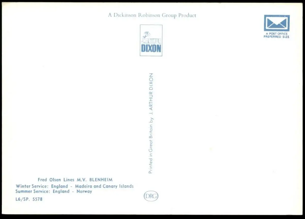 ÄLTERE POSTKARTE MS M.V. BLENHEIM FRED OLSEN LINES PASSAGIERFÄHRE WINTER SERVICE: ENGLAND MADEIRA AND CANARY ISLANDS SUMMER SERVICE: ENGLAND NORWAYVerlag: J. Arthur DixonGelaufen: neinErhaltung (s. Scan): gut - sehr gut / 916707