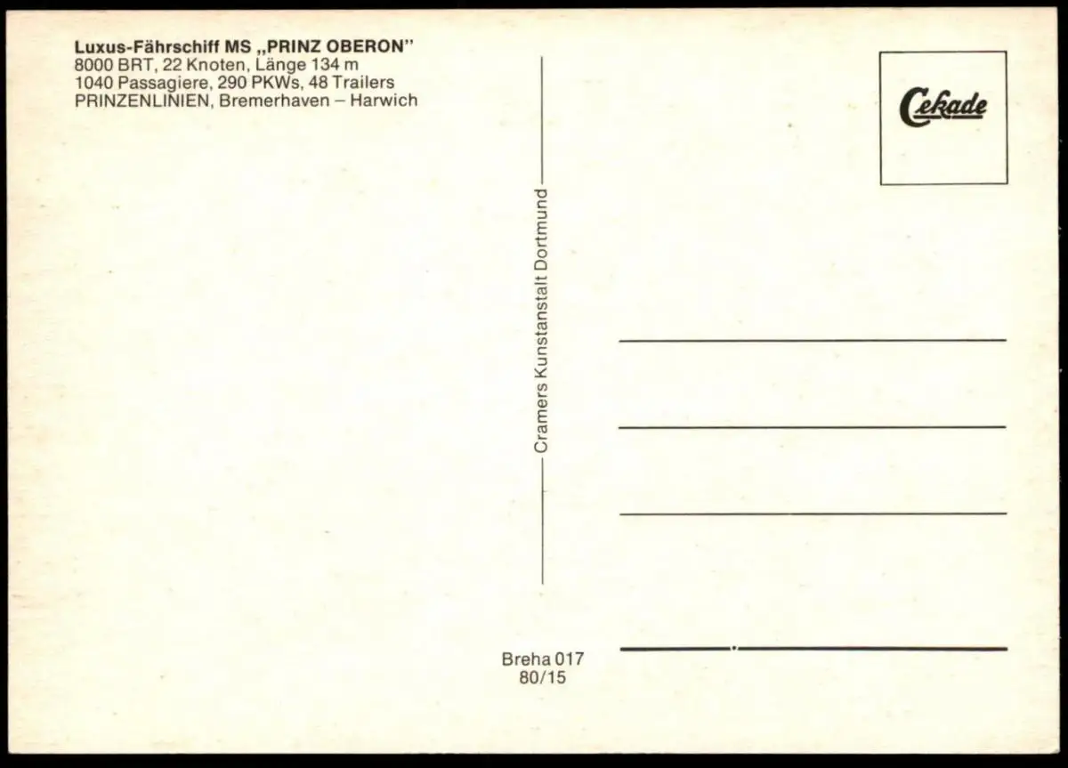 ÄLTERE POSTKARTE MS PRINZ OBERON LUXUS-FÄHRE M/S SCHIFF PRINZENLINIEN BREMERHAVEN HARWICH Verlag: Cramers, Dortmund