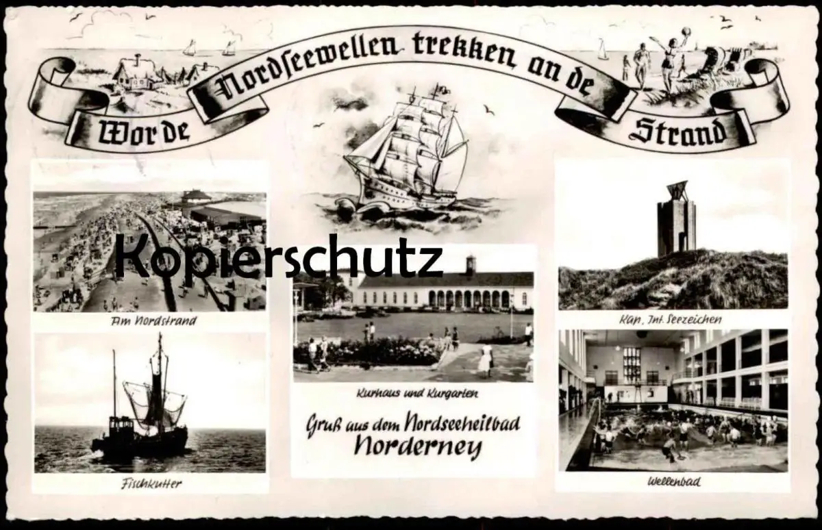 ÄLTERE POSTKARTE GRUSS AUS DEM NORDSEEHEILBAD NORDERNEY WOR DE NORDSEEWELLEN TREKKEN AN DE STRAND Am Nordstrand Fischkutter Kurhaus und Kurgarten Kap. Int. Seezeichen Wellebad