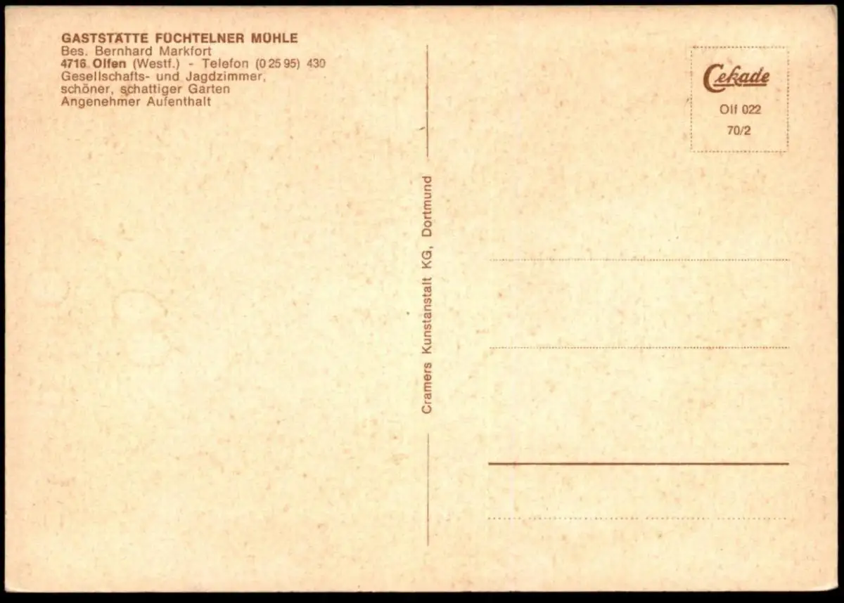 ÄLTERE POSTKARTE OLFEN IN WESTFALEN FÜCHTELNER MÜHLE BESITZER BERNHARD MARKFORT GESELLSCHAFTSZIMMER JAGDZIMMER SCHÖNER SCHATTIGER GARTEN SPIEGEL KRONLEUCHTER BARVerlag: Cramers, Dortmund
