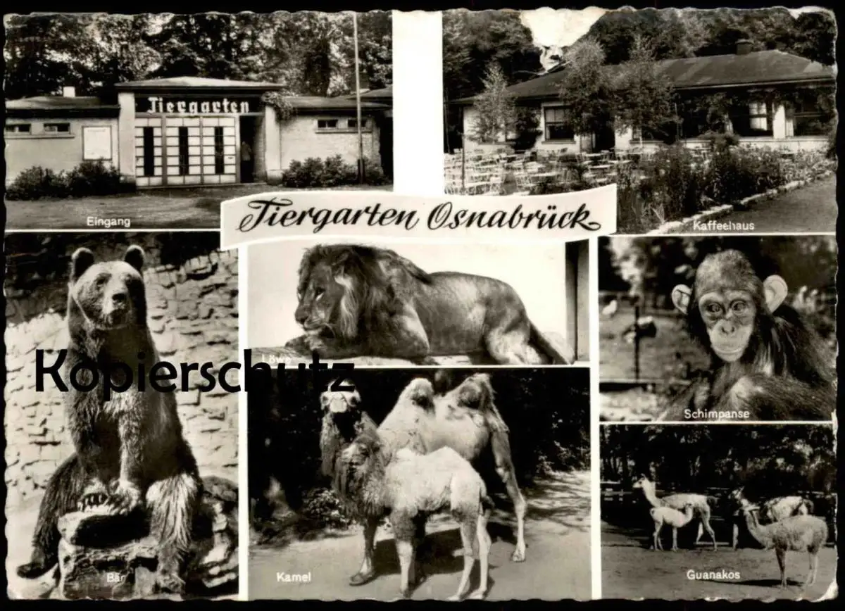 ÄLTERE POSTKARTE OSNABRÜCK TIERGARTEN OSNABRÜCKER ZOO BÄR SCHIMPANSE GUANAKO KAMEL ours bear camel AK cpa postcard