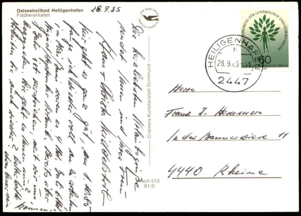 Gelaufen: 28.09.1985 mit Stempel Heiligenhafen nach Rheine