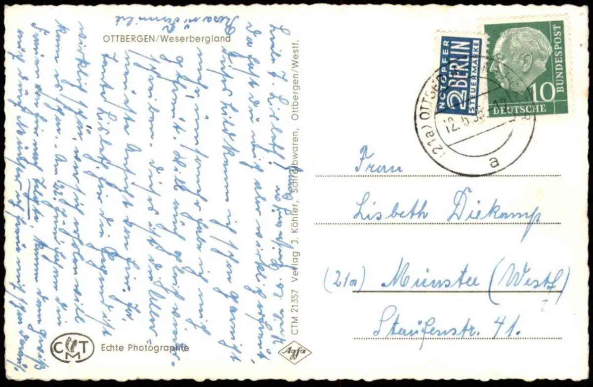 Gelaufen: 12.05.1955 mit Stempel Ottbergen nach Münster