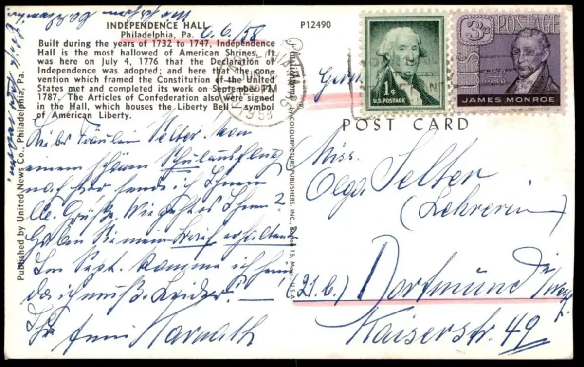 Gelaufen: 06.06.1958 mit Stempel Philadelphia nach Dortmund