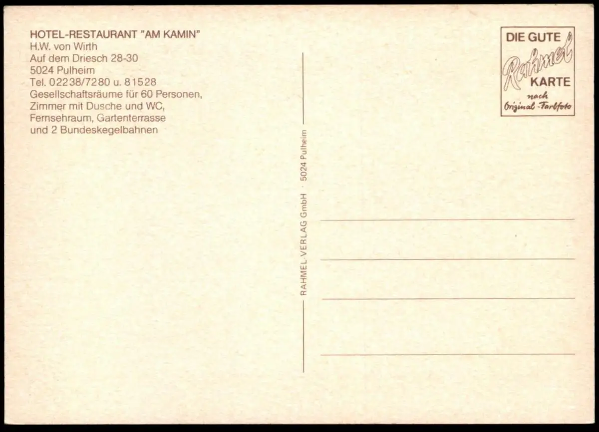 ÄLTERE POSTKARTE PULHEIM HOTEL RESTAURANT AM KAMIN H. W. VON WIRTH