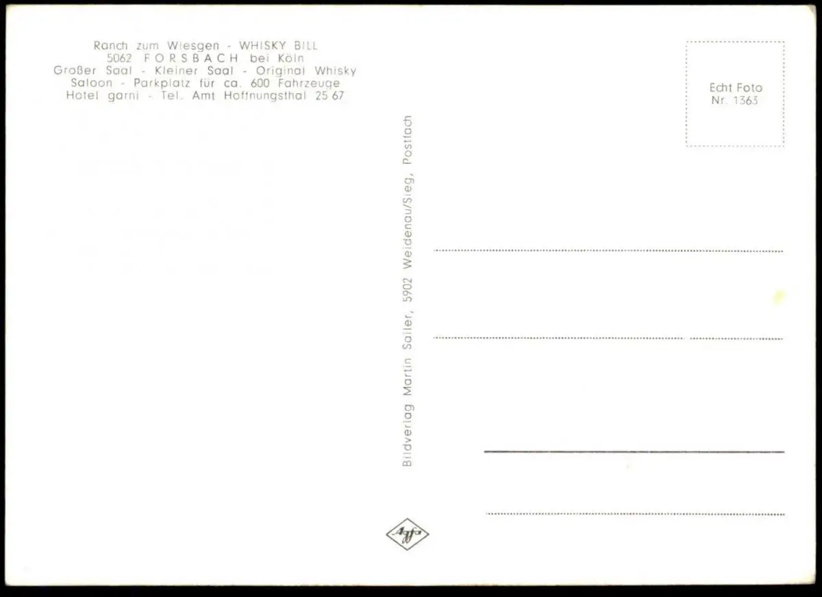 ÄLTERE POSTKARTE RANCH ZUM WIESGEN WHISKY BILL FORSBACH BEI KÖLN GROSSER SAAL KLEINER SAAL ORIGINAL WHISKY SALOON PARKPLATZ FÜR CA. 600 FAHRZEUGE HOTEL GARNI TELEFON AMT HOFFNUNGSTHAL 2567Verlag: Martin Sailer, Weidenau / Sieg