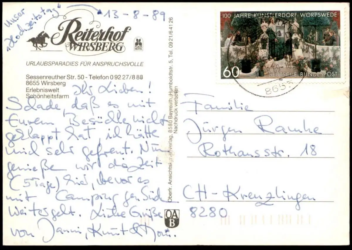 Gelaufen: 14.08.1989 mit Stempel Wirsberg nach Kreuzlingen