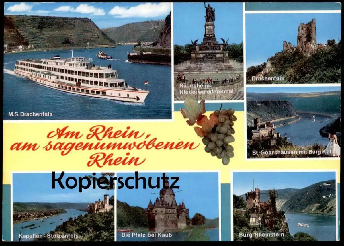 ÄLTERE POSTKARTE AM RHEIN, AM SAGENUMWOBENEN RHEIN M.S. DRACHENFELS ST. GOARSHAUSEN MIT BURG KATZ BURG RHEINSTEIN DIE PFALZ BEI KAUB KAPELLEN STOLZENFELS RÜDESHEIM NIEDERWALDDENKMAL