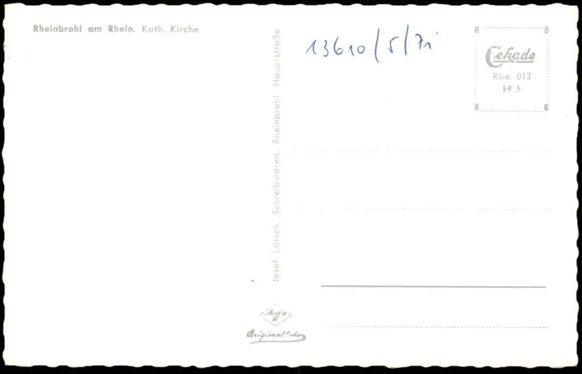 ÄLTERE POSTKARTE RHEINBROHL KATHOLISCHE KIRCHEVerlag: Josef Lötsch, Schreibwaren, Rheinbrohl Hauptstrasse
