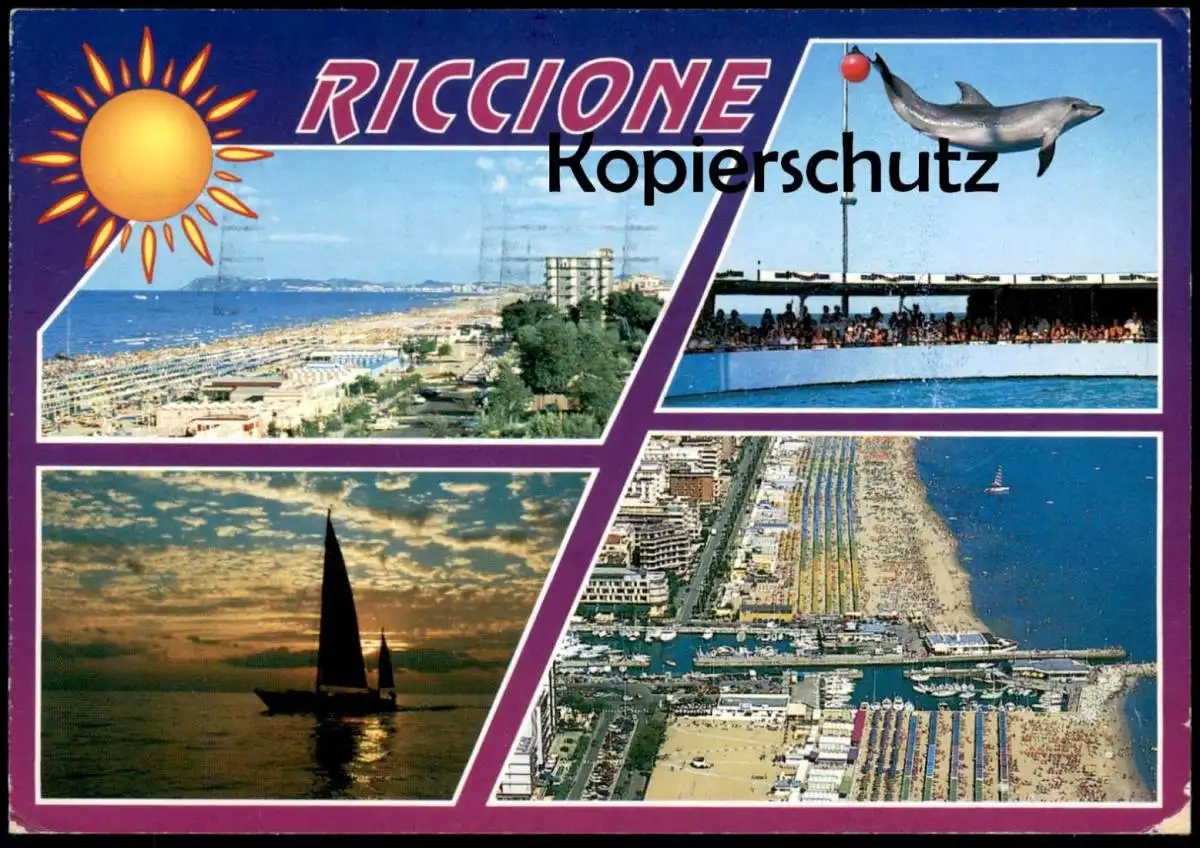 ÄLTERE POSTKARTE RICCIONE PANORAMA SONNENUNTERGANG SEGELBOOT DELPHIN-SHOW
