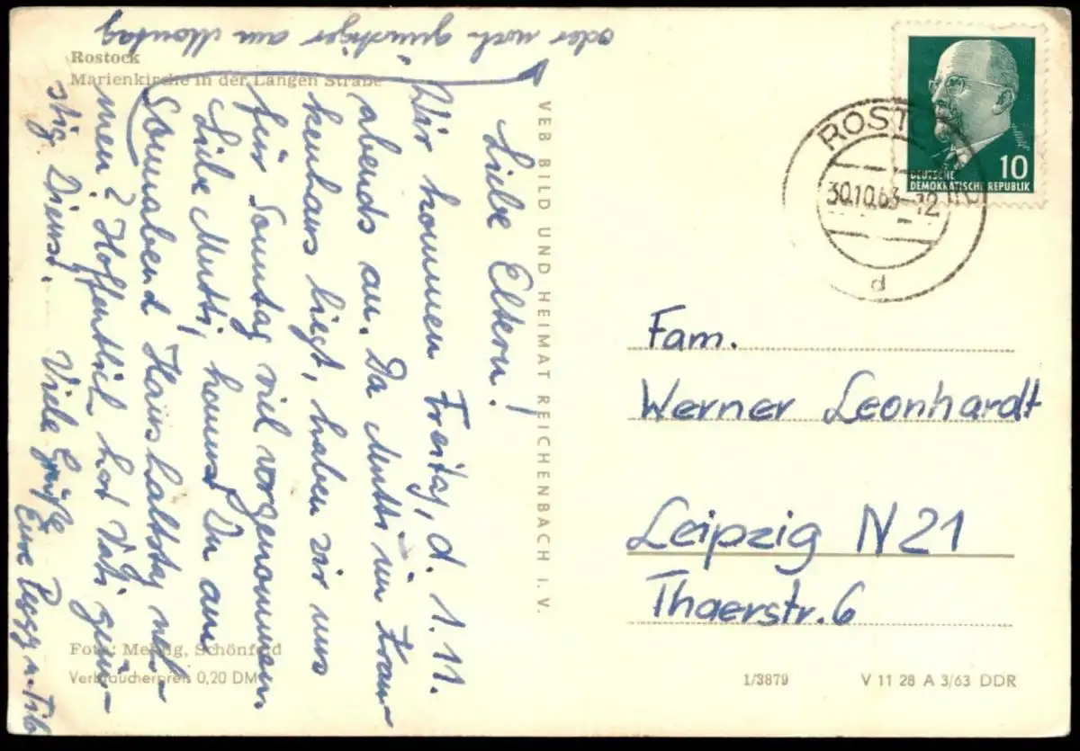 Gelaufen: 30.10.1963 mit Stempel Rostock nach LeipzigErhaltung (s. Scan): gut / 917196
