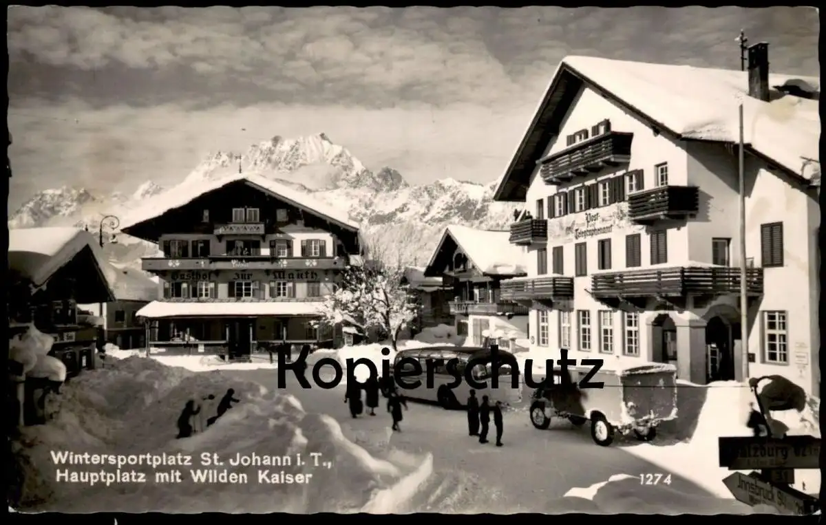 ÄLTERE POSTKARTE SANKT JOHANN IN TIROL ST. HAUPTPLATZ POST- UND TELEGRAPHENAMT AUTOS AUTO BUS SCHNEE WINTER