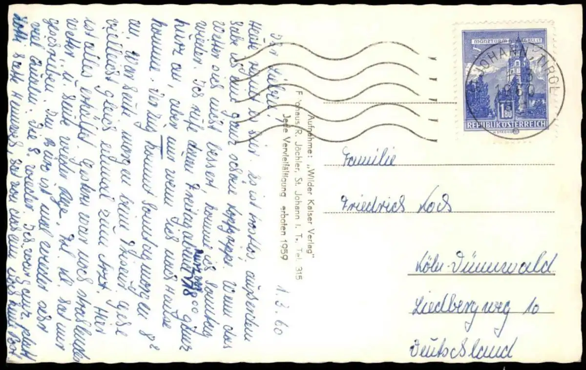 Gelaufen: 01.03.1960 mit Stempel St. Johann in Tirol nach Köln Dünnwald