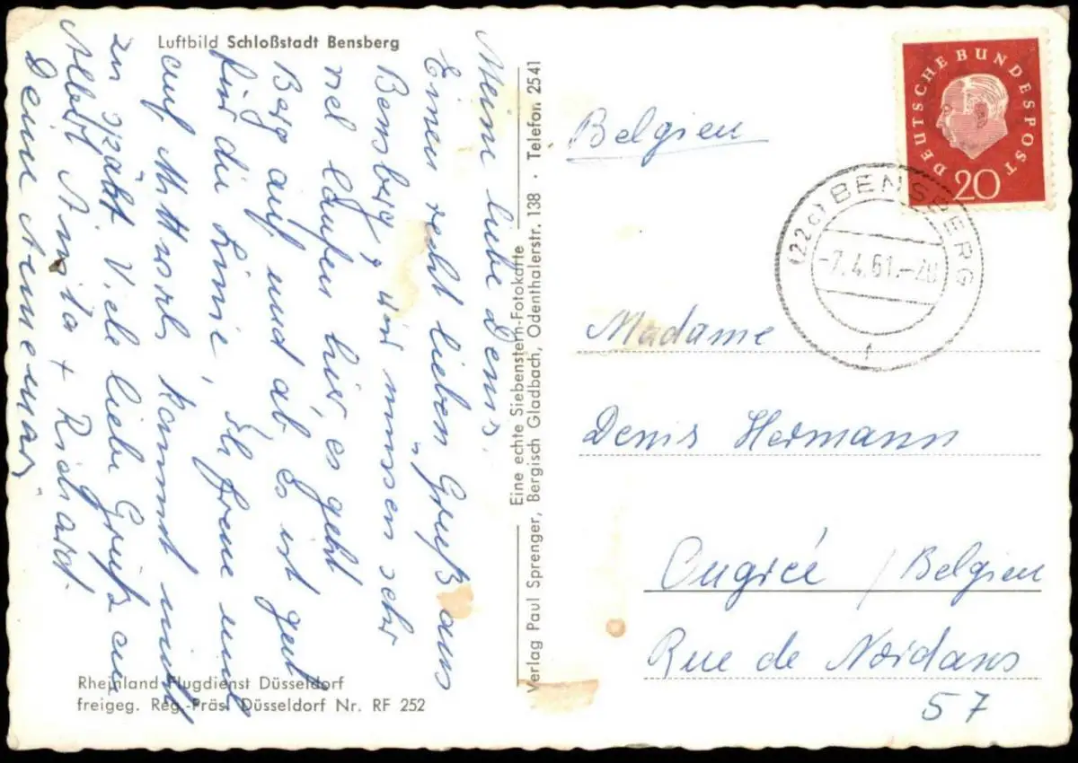 Gelaufen: 07.04.1961 mit Stempel Bensberg nach Ougrée Belgien