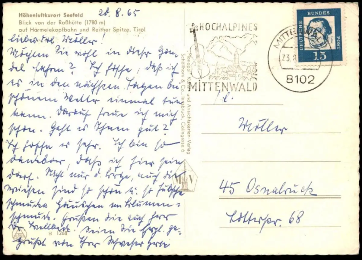 Gelaufen: 23.08.1965 mit Stempel Mittenwald nach Osnabrück