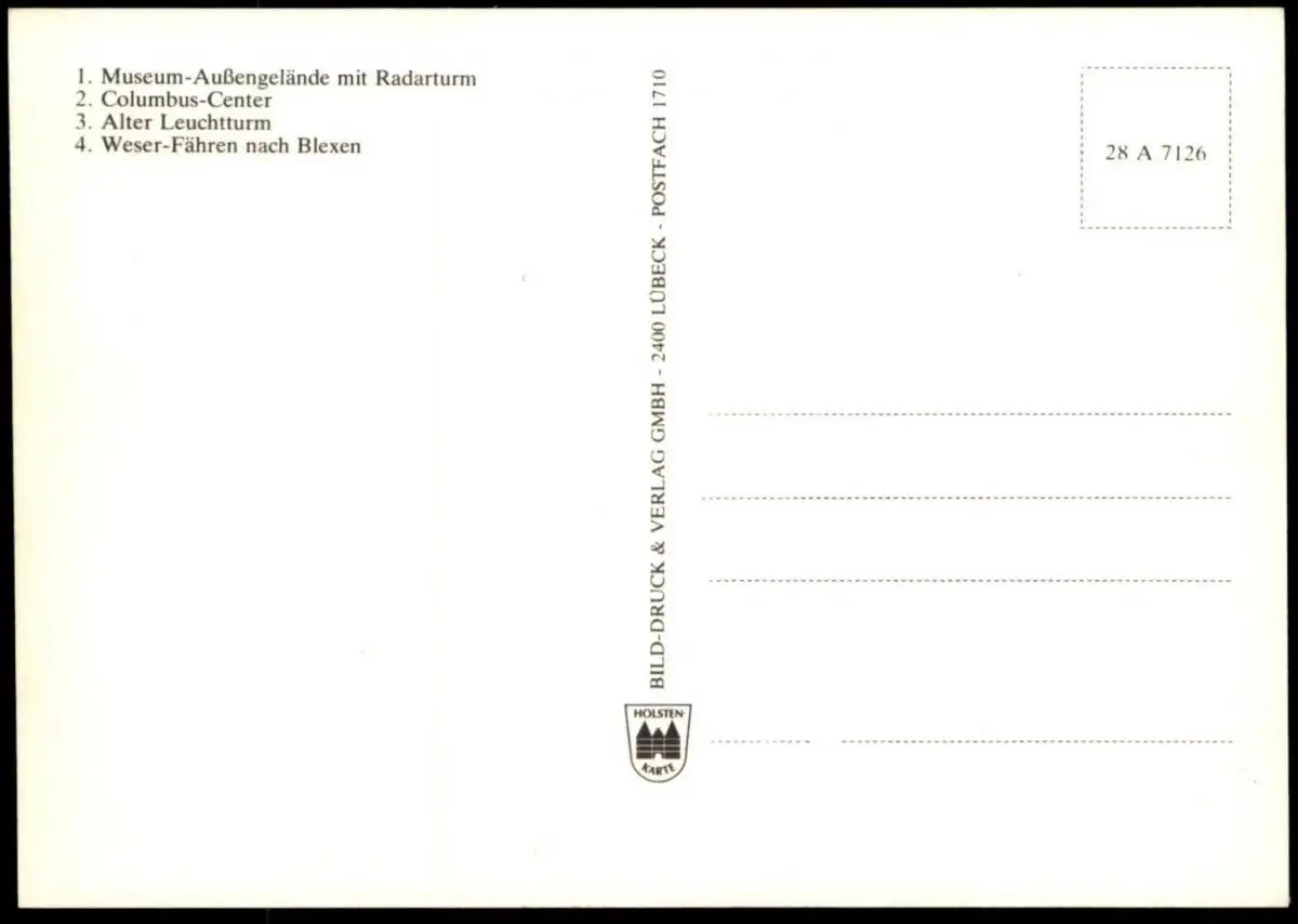 ÄLTERE POSTKARTE SEESTADT BREMERHAVEN MUSEUM AUSSENGELÄNDE MIT RADARTURM COLUMBUS CENTER WESER FÄHREN NACH BLEXEN ALTER LEUCHTTURMVerlag: Bild-Druck Verlag GmbH, LübeckGelaufen: neinErhaltung (s. Scan): sehr gut / 916863