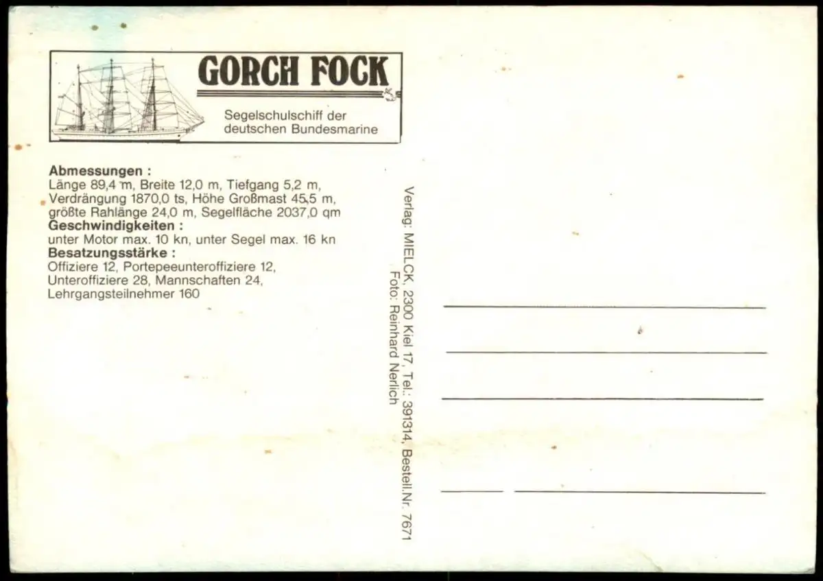 ÄLTERE POSTKARTE SEGELSCHULSCHIFF DER DEUTSCHEN BUNDESMARINE GORCH FOCK SEGELSCHIFFVerlag: Mielck, Kiel; Foto: Reinhard Nerlich