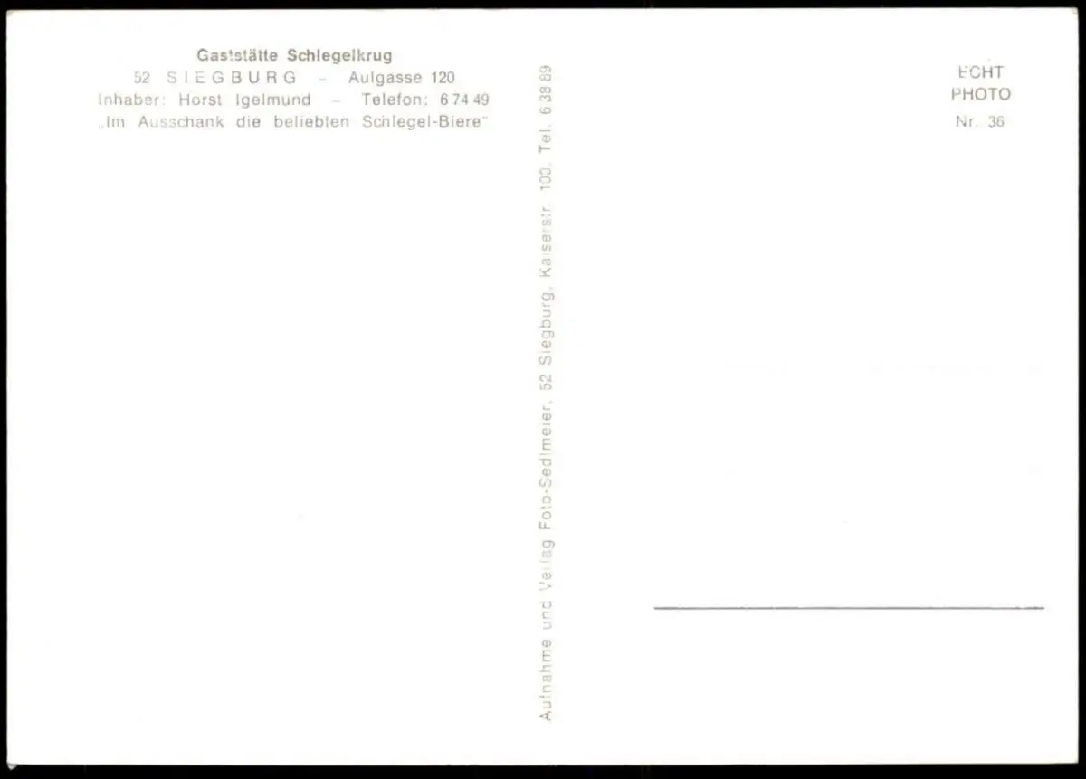 ÄLTERE POSTKARTE SIEGBURG GASTSTÄTTE SCHLEGELKRUG AULGASSE 120 SCHLEGEL BIER THEKE COKA COLA UHR INHABER HORST IGELMUND