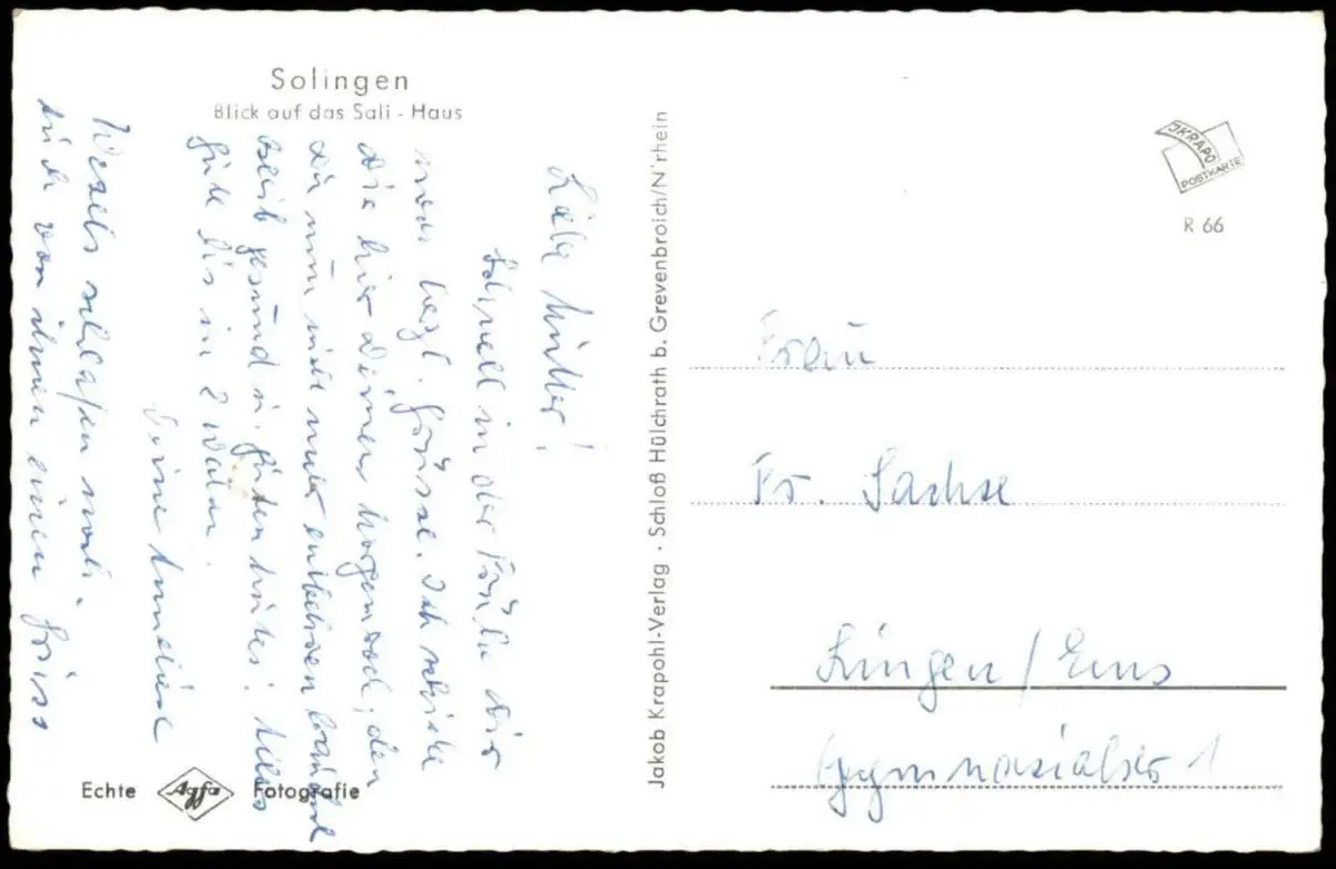 ÄLTERE POSTKARTE SOLINGEN BLICK AUF DAS SALI-HAUS GESCHÄFTE OHLIGER STRÄTER DAKVerlag: Jakob Krapohl, Schloss Hülchrath