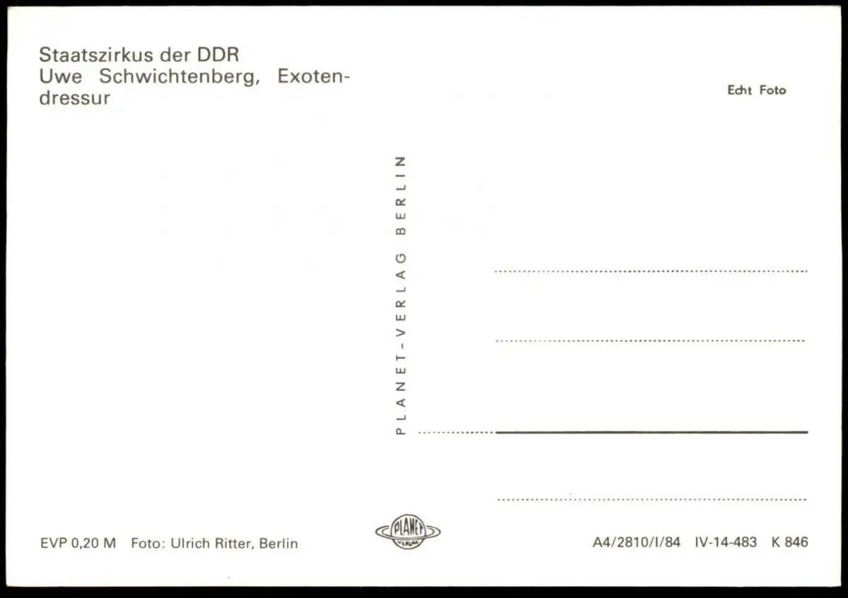 ÄLTERE POSTKARTE STAATSZIRKUS DER DDR UWE SCHWICHTENBERG EXOTEN-DRESSURVerlag: Planet Verlag, Berlin