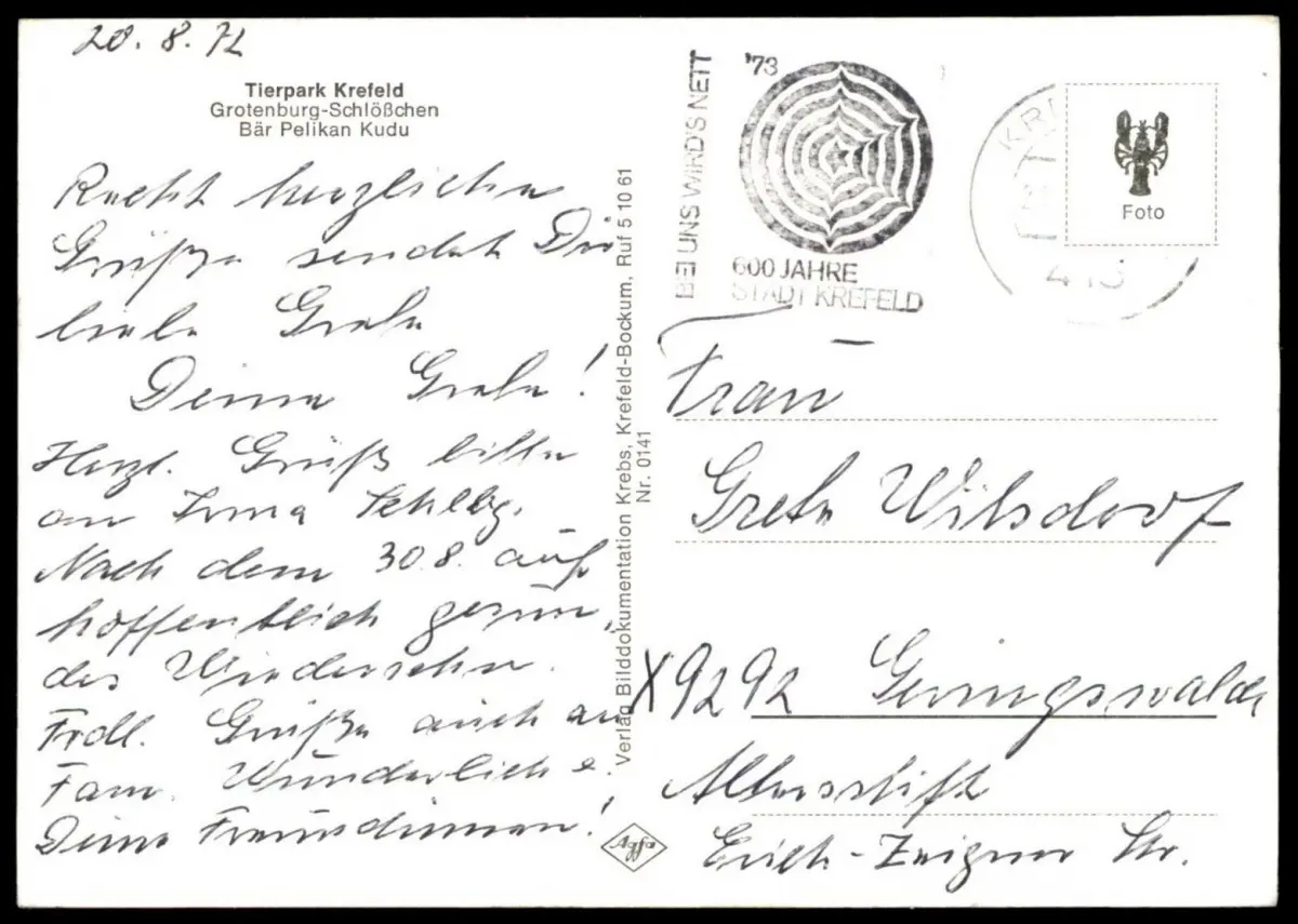 Gelaufen: 21.08.1972 mit Stempel Krefeld nach Geringswalde, Briefmarke (sauber) entfernt