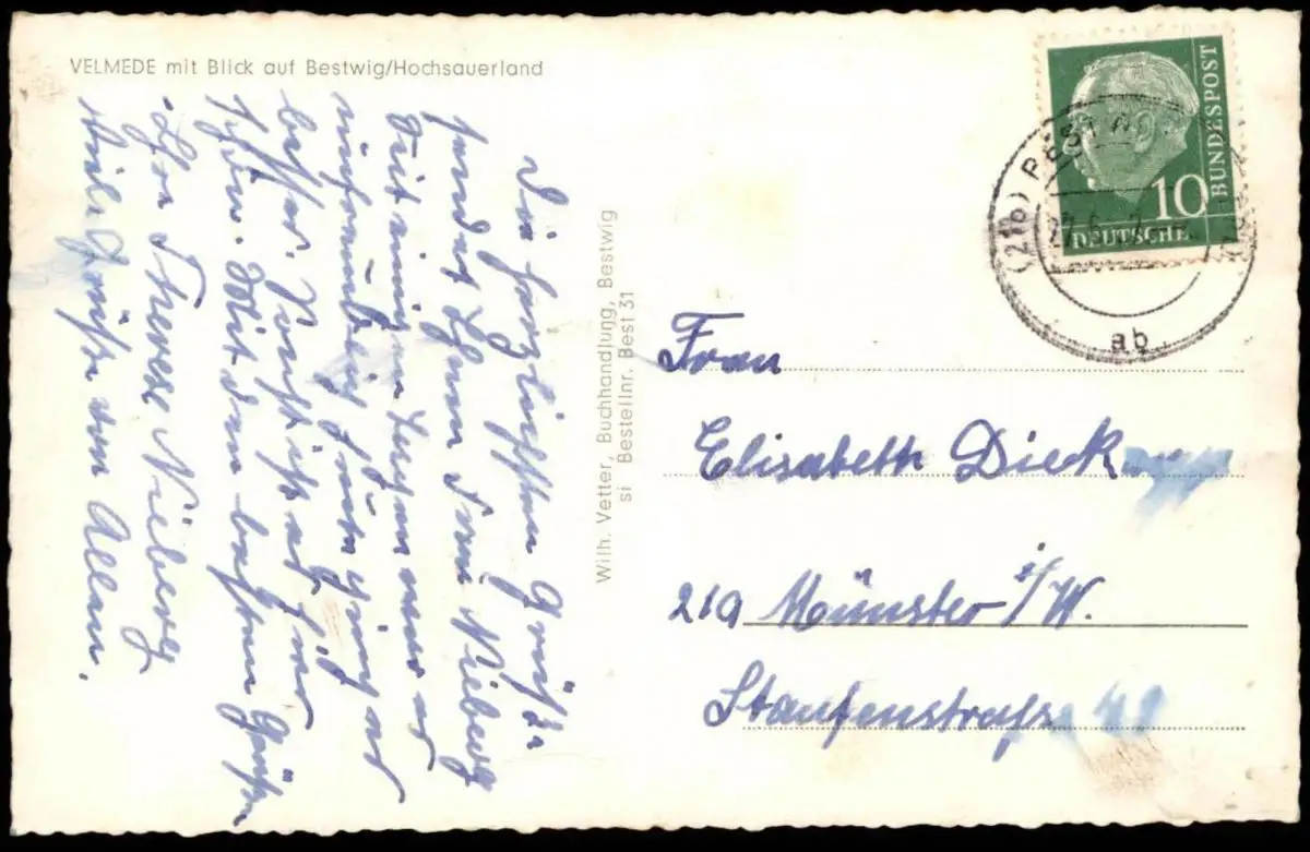 Verlag: Wilh. Vetter, Buchhandlung, BestwigGelaufen: 27.05.1957 mit Stempel Bestwig nach MünsterErhaltung (s. Scan): gut / 917759