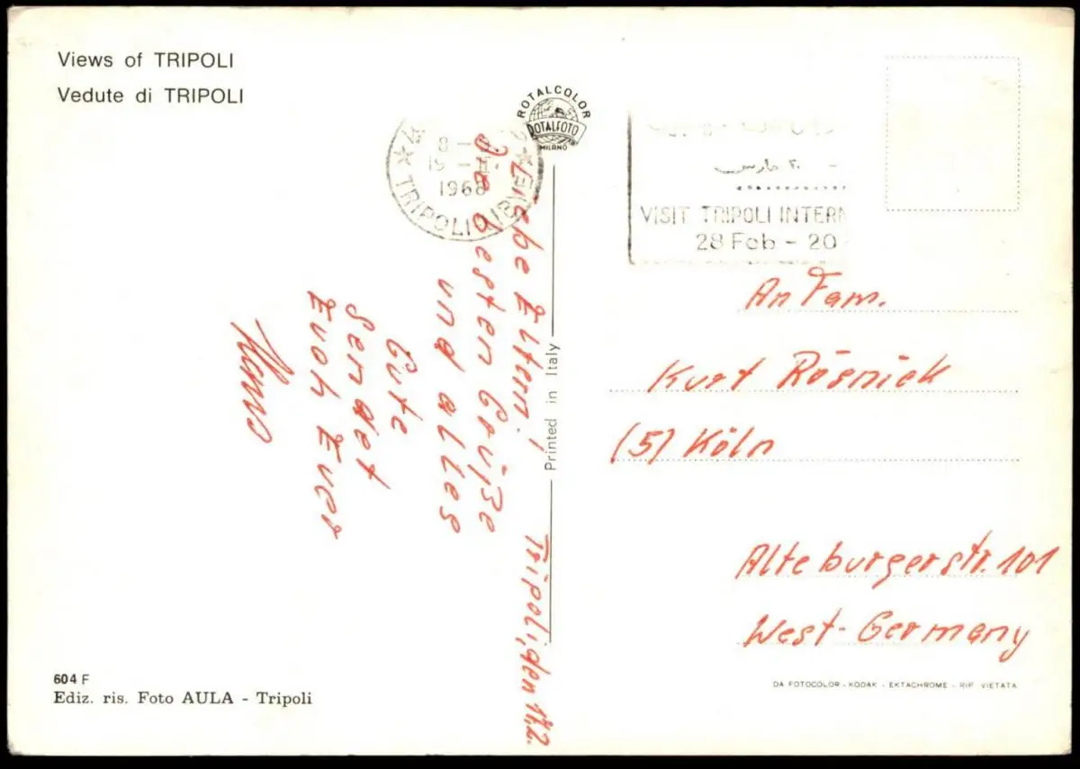 Gelaufen: 19.02.1968 mit Stempel Tripoli nach Köln, Briefmarke (sauber) entfernt