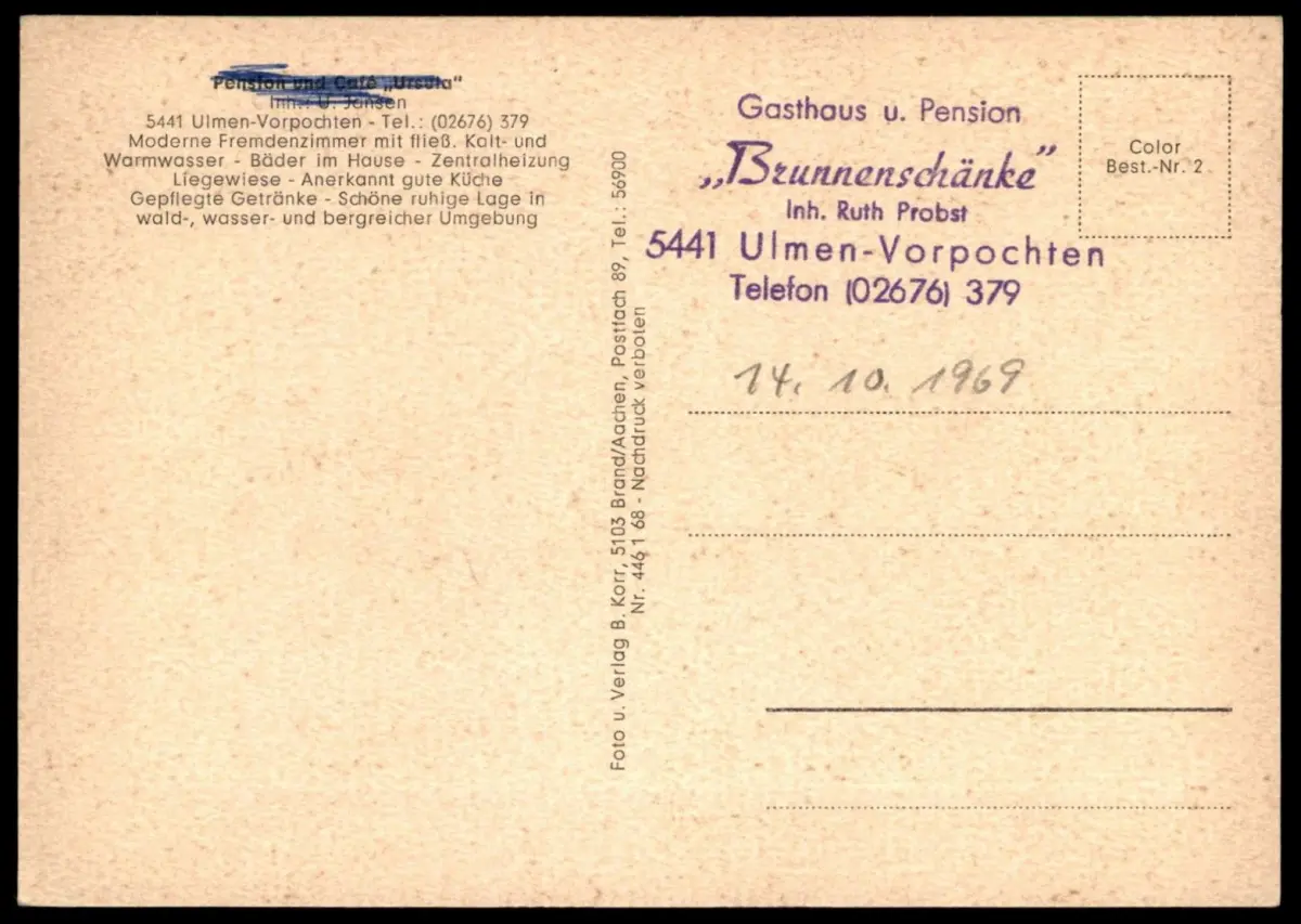 Gelaufen: nein, rückseitig Stempel Gasthaus und Pension "Brunnenschänke" Inh. Ruth Probst Ulmen-Vorpochten, 14.10.1969
