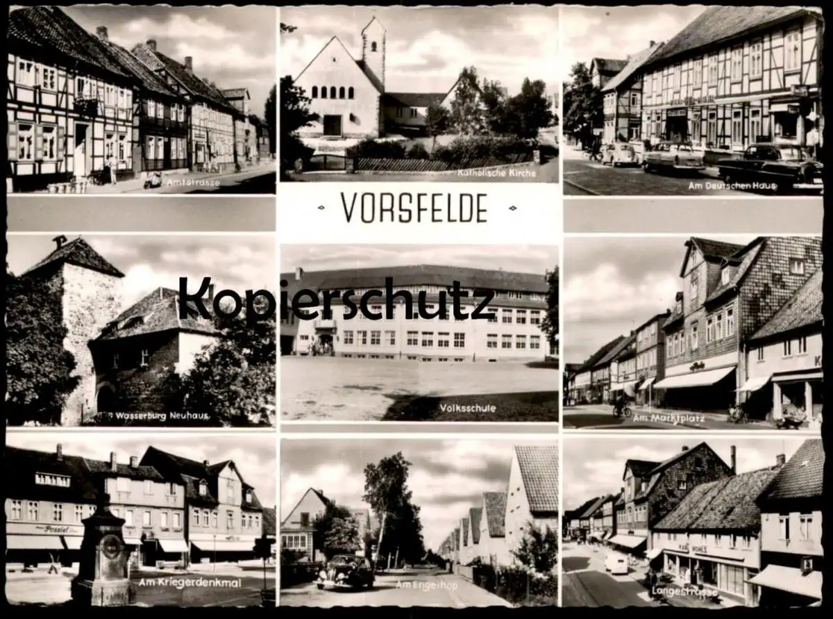 ÄLTERE POSTKARTE VORSFELDE LANGESTRASSE GESCHÄFT KARL HOHLS HOTEL DEUTSCHES HAUS JEVER PILSENER VW KÄFER AM MARKTPLATZ KATHOLISCHE KIRCHE AM ENGELHOP VOLKSSCHULE AM KRIEGERDENKMAL WASSERBURG NEUHAUS AMTSTRASSE WOLFSBURGVerlag: K. Engelke, Buchhandlung Vorsfelde