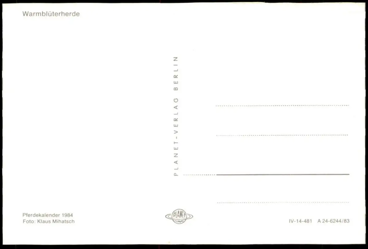 ÄLTERE POSTKARTE WARMBLÜTERHERDE AUF EINER WIESEVerlag: Planet Verlag, Berlin; Pferdekalender 1984, Foto: Klaus Mihatsch