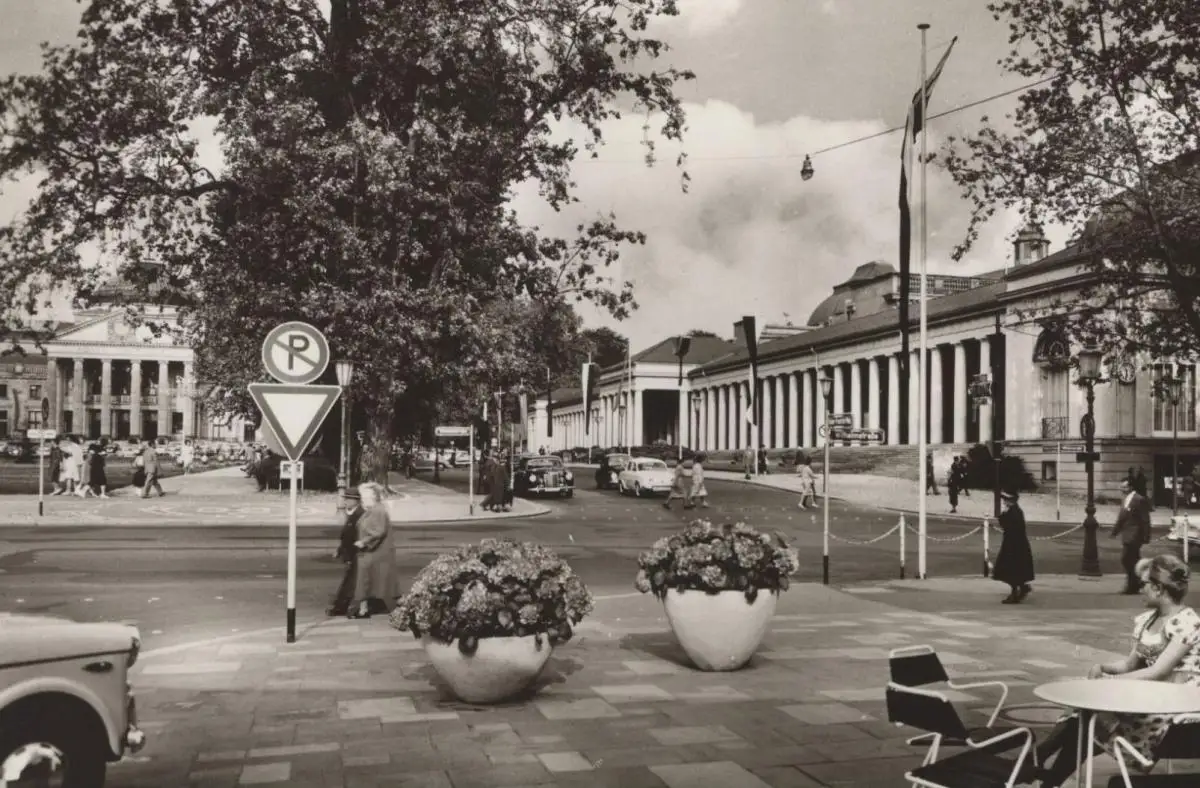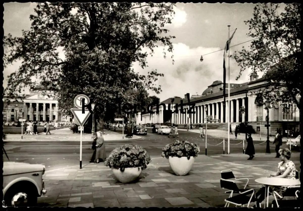 ÄLTERE POSTKARTE WIESBADEN KURHAUS UND THEATERKOLONNADE VERKEHRSZEICHEN PARKVERBOT AK cpa postcard Ansichtskarte