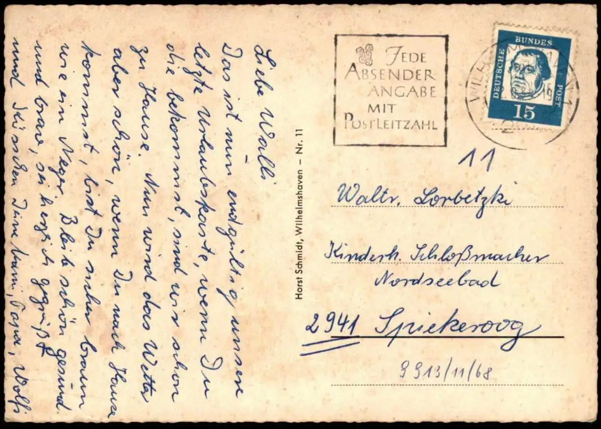Gelaufen: 02.08.1964 mit Stempel Wilhelmshaven “Jede Absenderangabe mit Postleitzahl” nach Spiekeroog