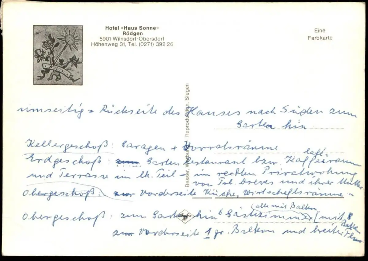 ÄLTERE POSTKARTE WILNSDORF-OBERSDORF HAUS SONNE RÖDGEN, rückseitig Sonnenuhr