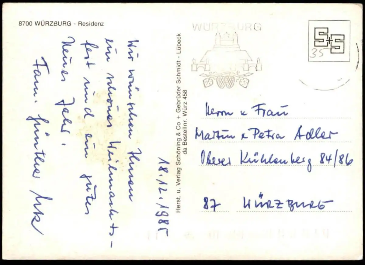 Gelaufen: 18.12.1985 nach Würzburg, Briefmarke sauber entfernt